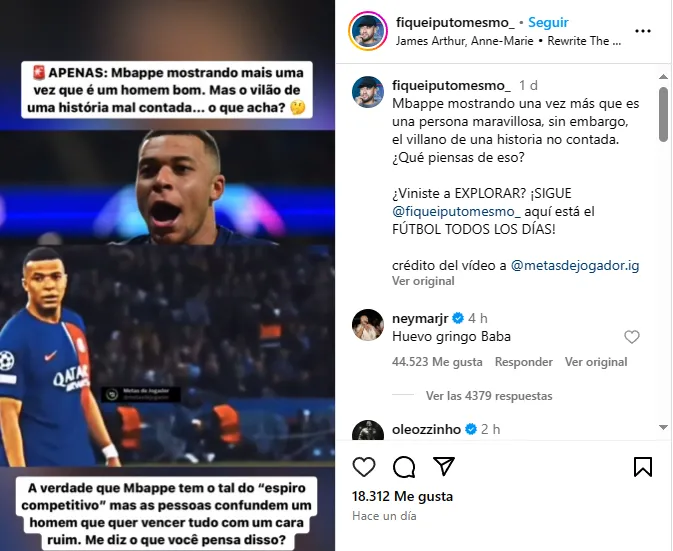 Una cuenta de Instagram en idioma portugués se deshizo en elogios para el crack francés con comentarios desde “el villano de una historia mal contada” hasta “un buen hombre con espíritu competitivo”. Ney no tardó en aparecer en la caja de comentarios.