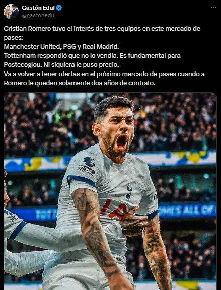 “Tottenham respondió que no lo vendía. Es fundamental para Postecoglou. Ni siquiera le puso precio. Va a volver a tener ofertas en el próximo mercado de pases cuando a Romero le queden solamente dos años de contrato“, destacó Edul en su cuenta de X.