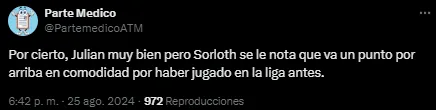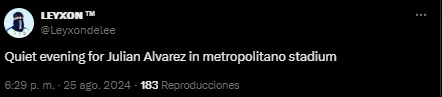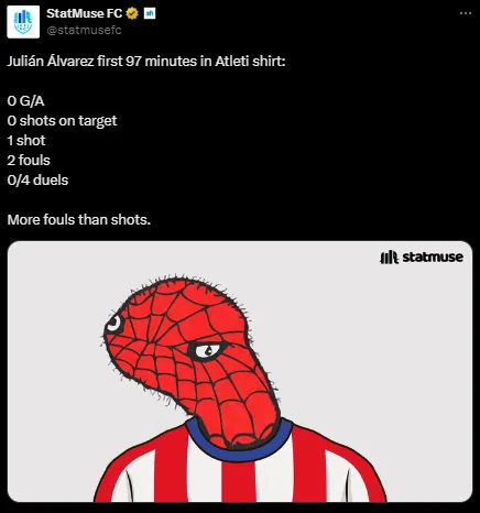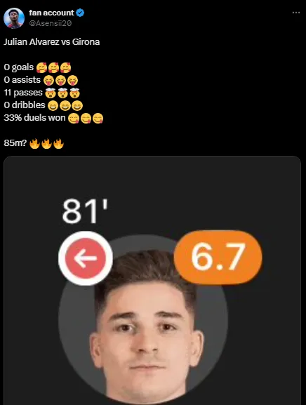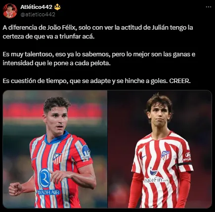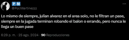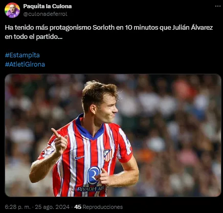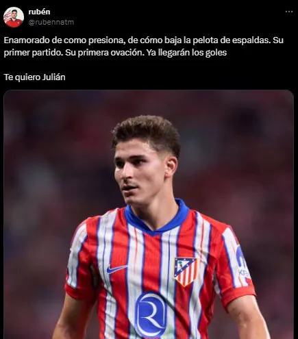 “Noche tranquila para Julián Álvarez en el Metropolitano“, describió un hincha, mientras que otro disparó: “Ha tenido más protagonismo Sorloth en 10 minutos que Julián Álvarez en todo el partido“.