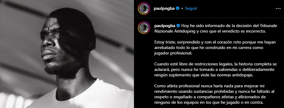 Tras el fallo del Tribunal Nacional de Dopaje en Italia, Paul Pogba escribió en sus redes sociales: “Hoy he sido informado de la decisión del Tribunal Nacional Antidoping y creo que el veredicto es incorrecto. Estoy triste, sorprendido y con el corazón roto porque me hayan arrebatado todo lo que he construido en mi carrera como jugador profesional“.