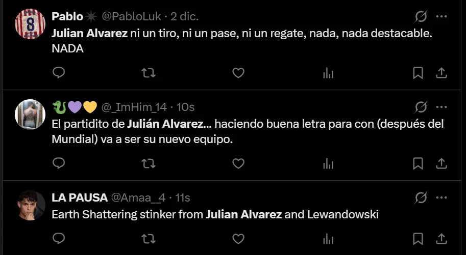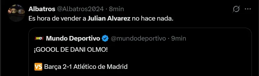Atlético de Madrid no tuvo una buena actuación, perdió frente a Barcelona y quedó en la cuarta posición de LaLiga 2025-2026, a tan solo 6 unidades del elenco liderado por Hansi Flick. A pesar de que los dirigidos por Diego Simeone afrontaron el cotejo con sus mejores intérpretes, el nivel que mostró Julián Álvarez no fue el esperado.