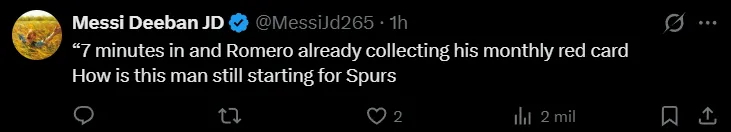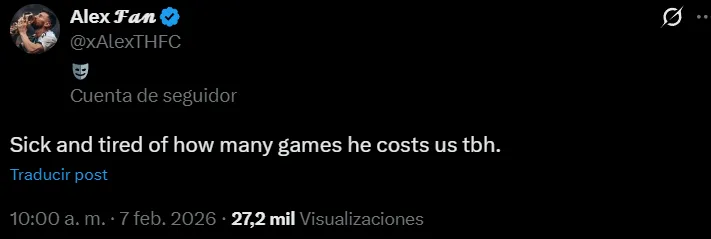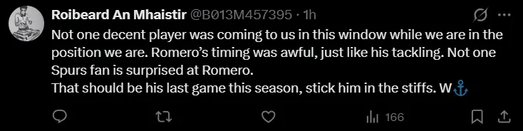 “Estoy harto y cansado de la cantidad de partidos que nos cuesta, sinceramente”, hizo saber otro. “Irresponsabilidad absoluta. Decepcionando a sus compañeros de equipo y a sus fanáticos, OTRA VEZ”, arremetió un tercero. “Romero es un muy buen defensor, sin duda. Pero ningún club serio compra a un jugador tan irresponsable, porque no juega con los sentidos”, manifestó uno más. “Ya cobra su tarjeta roja mensual. ¿Cómo es que este hombre sigue siendo parte de los Spurs”, se preguntó otro. “Ningún jugador decente nos llegó en esta ventana mientras estamos en la posición en la que estamos. El timing de Romero fue pésimo, al igual que sus entradas. Ningún aficionado de los Spurs se sorprende con Romero. Ese debería ser su último partido de la temporada; métanlo en la banca”, pidió uno más.