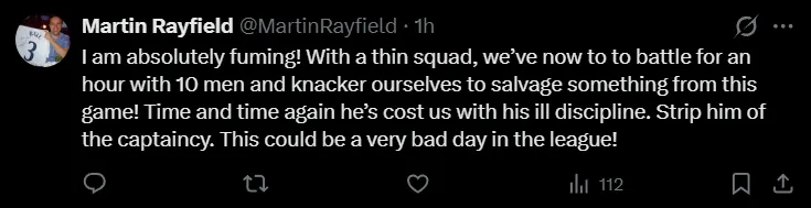 Si todavía le quedaba al capitán un bastión de resistencia en un gran número de hinchas que lo respaldaban, su temprana expulsión de este sábado en el partido que terminó con derrota 2-0 ante Manchester United hizo que muchos de ellos se bajaran del barco, recriminando su irresponsabilidad y acusándolo de estar pensando más en una salida que en la camiseta que le toca defender.