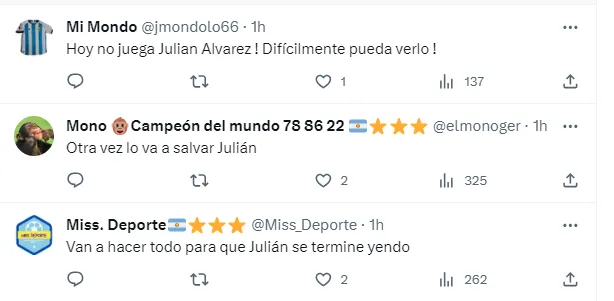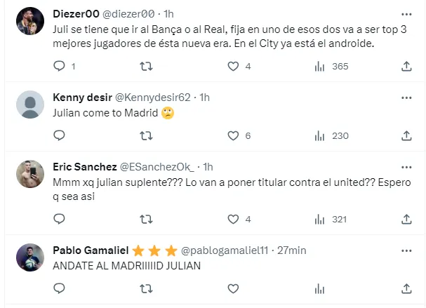 Algunos, enojados afirmaban que el equipo inglés estaba haciendo todo lo posible para que el argentino se vaya del club, mientras que otros pedían que Álvarez sea nuevo refuerzo del Real Madrid para la próxima temporada. Además, criticaron al entrenador y aseguraron que la Araña iba a ingresar para salvarlo nuevamente.