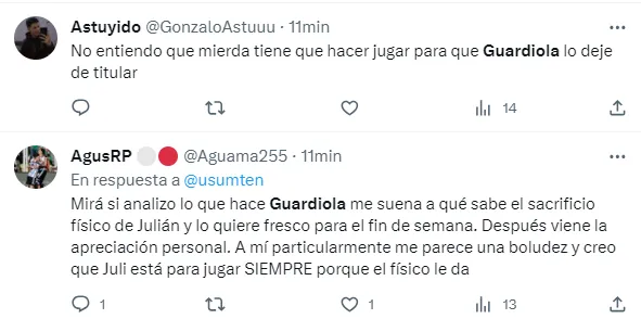 Rápidamente los hinchas argentinos y del Manchester City, estallaron en contra del entrenador español, ya que no compartían la decisión de que la Araña ocupe un lugar en el banco de los suplentes, y por eso hicieron tendencia a Pep Guardiola en las redes sociales, como en cada oportunidad que el delantero es suplente.