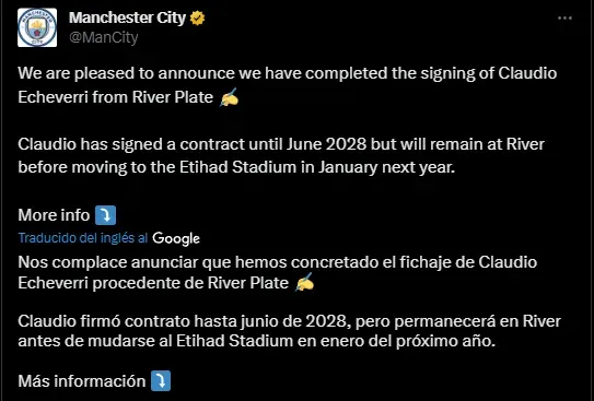 “River Plate y Manchester City llegaron a un acuerdo por la transferencia del futbolista Claudio Echeverri, quien seguirá vistiendo la camiseta de nuestro Club a lo largo del 2024 y luego continuará su carrera en el equipo inglés.