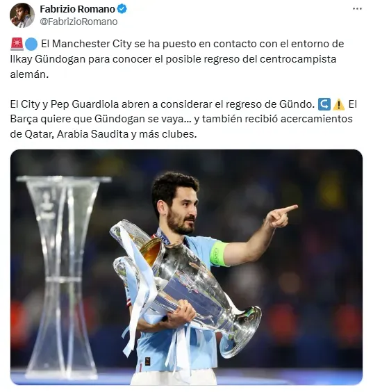 “Manchester City se ha puesto en contacto con el entorno de Ilkay Gündogan para conocer el posible regreso del centrocampista alemán. Pep consideró su retorno”, indicó Fabrizio a través de sus redes sociales oficiales.