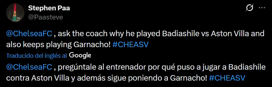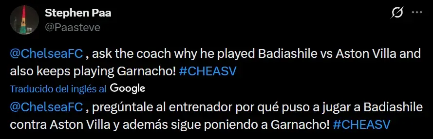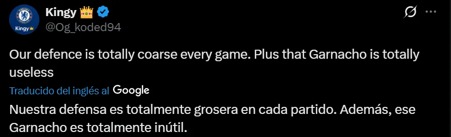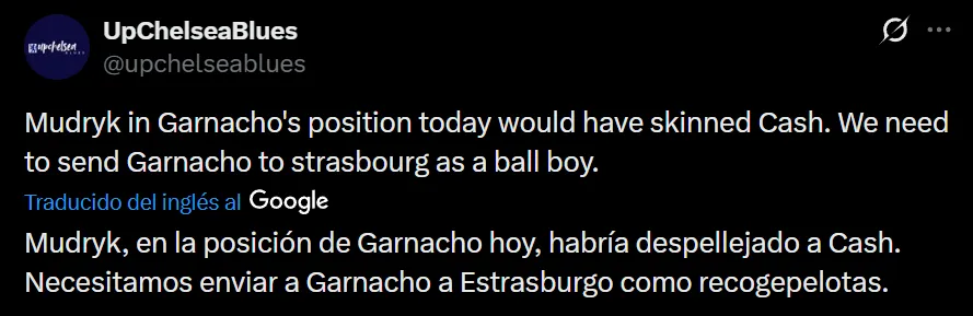A través de las redes sociales, los fanáticos de Chelsea se mostraron muy en desacuerdo con la presencia del ex Manchester United, y solicitaron que la junta directiva se deshaga de él en este mercado de pases: “Mudryk, en la posición de Garnacho hoy, habría despellejado a Cash. Necesitamos enviar a Garnacho a Estrasburgo como recogepelotas”, aseveró el usuario @upchelseablues en X.