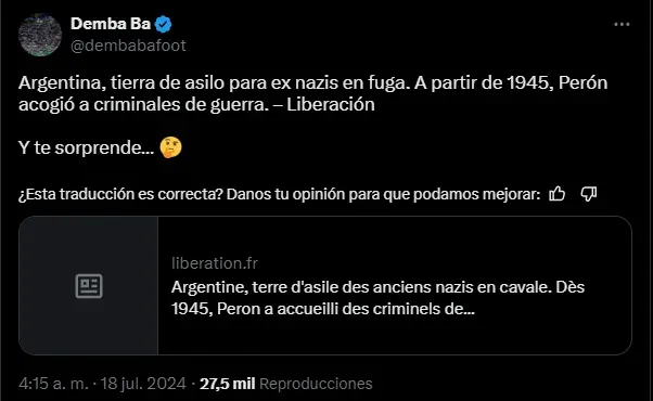 Aún así, ninguno ha sido más controversial que Demba Ba, un ex futbolista del Chelsea, nacido en Francia pero que representó a Senegal a nivel internacional. En su cuenta de X (ex Twitter), Ba compartió un artículo donde se vinculaba a Argentina y a los nazis y expresó lo siguiente: “Argentina, tierra de asilo para ex nazis en fuga. A partir de 1945, Perón acogió a criminales de guerra.”