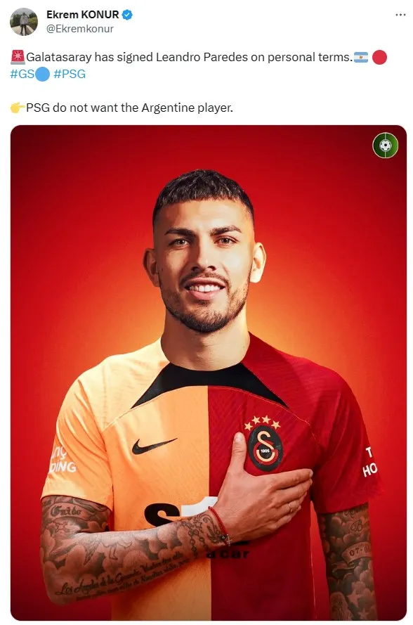 Ekrem Konur, periodista turco especializado en fichajes del fútbol, siguió la línea de lo reportado por Corriere dello Sport y dio a conocer el nuevo destino del centrocampista tras marcharse de la Juventus. “El Galatasaray ha llegado a un acuerdo con Leandro Paredes”, escribió en su cuenta oficial de Twitter junto a un diseño que ya ubica al jugador argentino con la camiseta del gigante de Turquía.