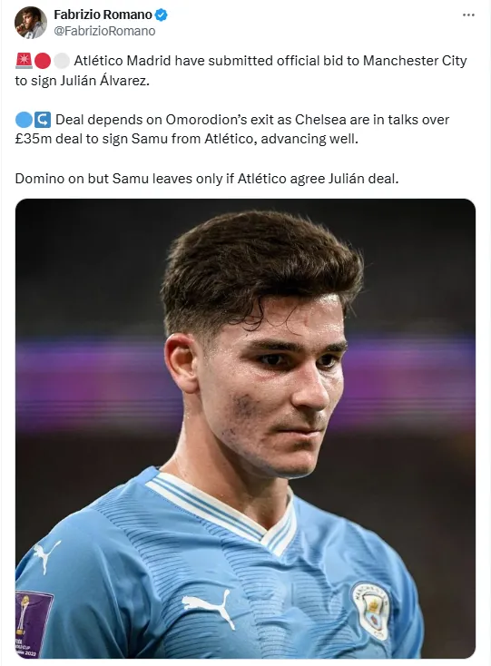 Según lo informó Fabrizio Romano, prestigioso periodista vinculado a los fichajes del fútbol a nivel mundial, la oferta del Atlético Madrid por Julián Álvarez existe. Sin embargo, la llegada del Araña dependerá de la salida de Samuel Omorodion, jugador por el cual Chelsea está negociando para comprárselo al Colchonero.