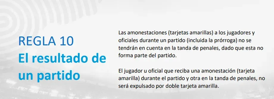“Las amonestaciones (tarjetas amarillas) a los jugadores y oficiales durante un partido (incluida la prórroga) no se tendrán en cuenta en la tanda de penales, dado que esta no forma parte del partido. El jugador u oficial que reciba una amonestación (tarjeta amarilla) durante el partido y otra en la tanda de penales, no será expulsado por doble tarjeta amarilla”.