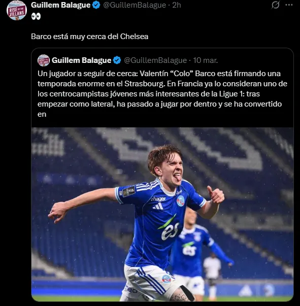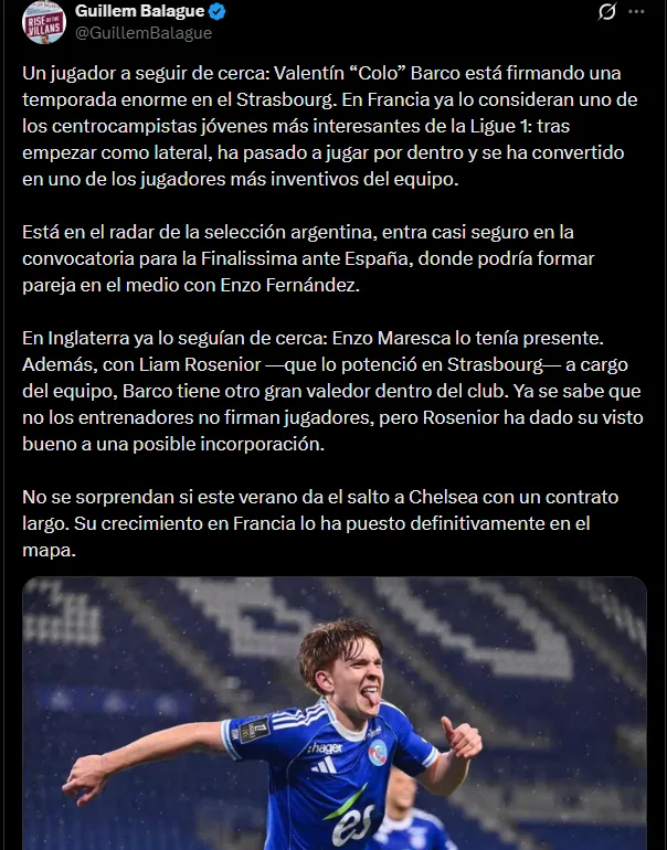 En su cuenta de X, el jornalista expresó: “En Inglaterra ya lo seguían de cerca: Enzo Maresca lo tenía presente. Además, con Liam Rosenior —que lo potenció en Estrasburgo— a cargo del equipo, Barco tiene otro gran valedor dentro del club. Ya se sabe que no los entrenadores no firman jugadores, pero Rosenior ha dado su visto bueno a una posible incorporación”.