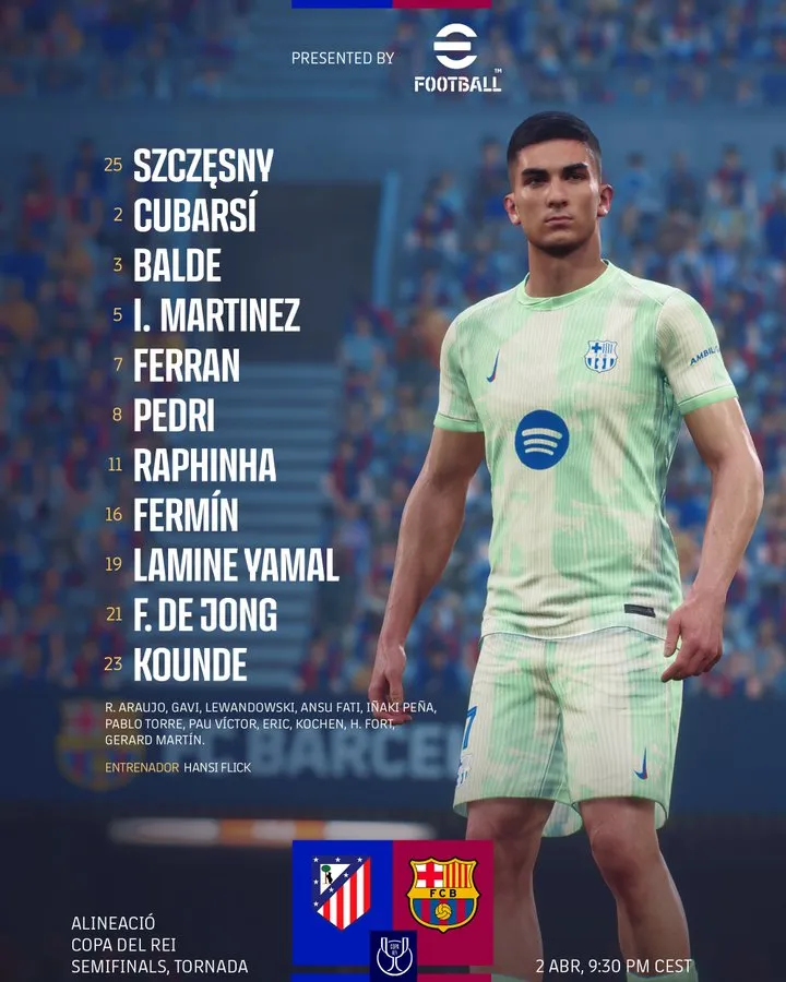 Wojciech Szczęsny; Jules Koundé, Pau Cubarsí, Íñigo Martínez, Alejandro Balde; Pedri, Frenkie de Jong; Lamine Yamal, Fermín, Raphinha; Ferran Torres.