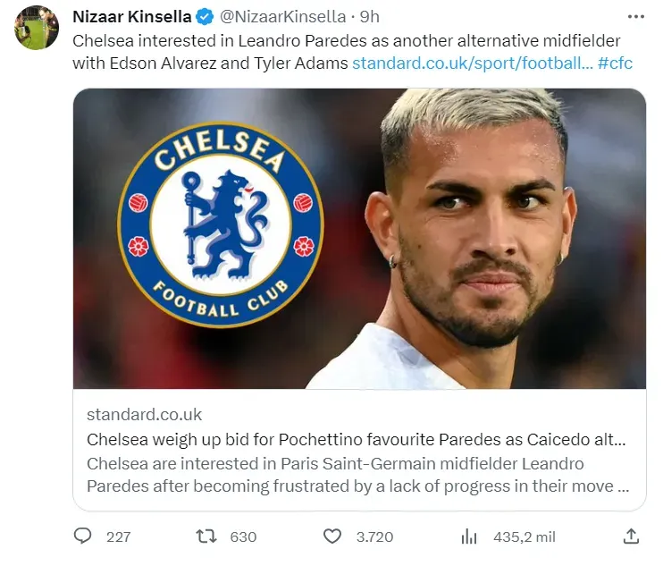 Según informó el importante periodista británico Nizaar Kinsella, el argentino aparece como alternativa luego de las complicaciones de los Blues para negociar con Brighton por Moisés Caicedo. Con 29 años, el surgido en Boca está buscando una salida del fútbol francés.