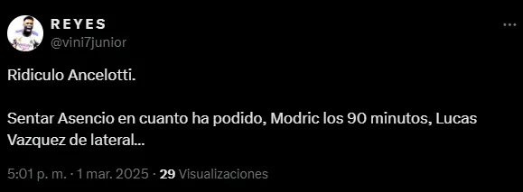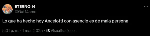 Por eso, a raíz de la ausencia de este joven defensor, muchos hinchas se enojaron con el entrenador italiano y lo manifestaron en X (Twitter). “Lo que ha hecho hoy Ancelotti con Asencio es de mala persona“, tiró un aficionado. “Ridículo“, opinó otro fanático.