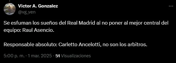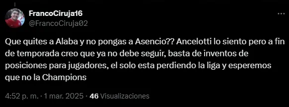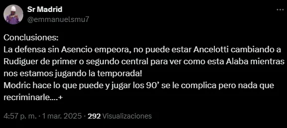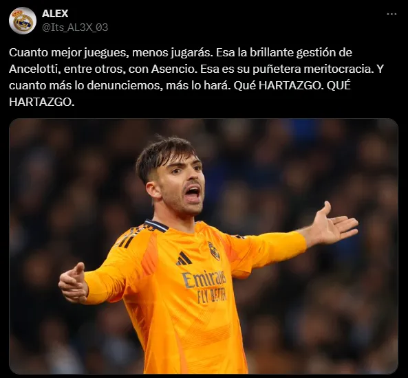 “Cuanto mejor juegues, menos jugarás. Esa es la brillante gestión de Ancelotti, entre otros, con Asencio. ¡Qué hartazgo!”, cuestionó otro hincha. “Imagínate dejar a Mbappé o Bellingham en la banca. Pues eso es lo que esta haciendo Ancelotti con Asencio. No tiene sentido alguno“, criticó otro aficionado ‘merengue’.
