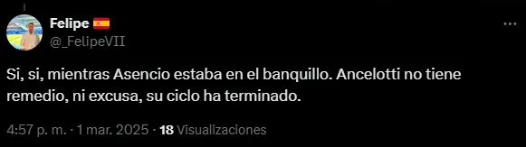 Otros hinchas también hasta deslizaron la chance de que Ancelotti deje su cargo como entrenador. “Asencio en el banquillo. Ancelotti no tiene remedio, ni excusa, su ciclo ha terminado“, opinó un fanático. “A fin de temporada creo que ya no debe seguir“, tiró otro.