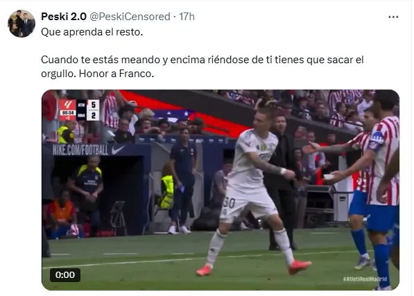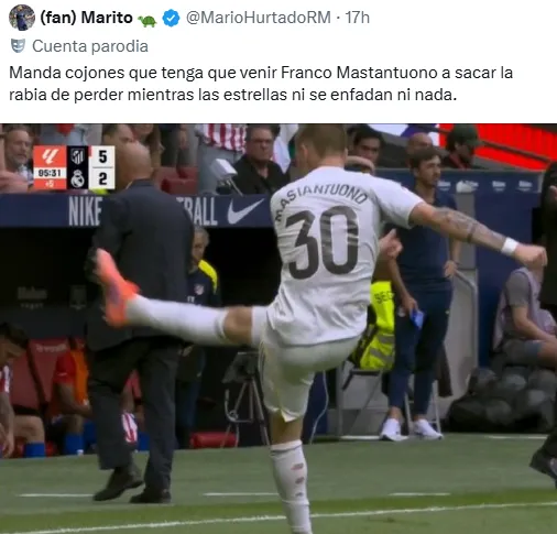 Además, algunos prefirieron destacar el empuje con el que el ex River se mostró en la media hora que pudo jugar. ”Que tenga que venir Franco Mastantuono a sacar la rabia de perder mientras las estrellas ni se enfadan ni nada”, ”honor chaval, el que menos tiene la culpa pero al menos se va jodido a la casa, que aprendan los ‘capitanes”’ y ”cuando se están riendo de ti tienes que sacar el orgullo. Honor a Franco”, fueron algunas de las opiniones.