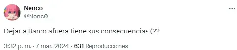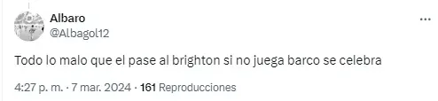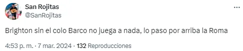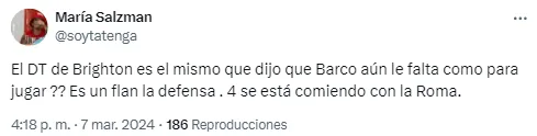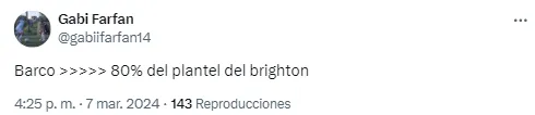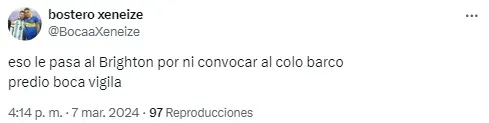 Los argentinos también se hicieron presentes en las redes y algunos se alegraron de la derrota de Brighton con comentarios como “dejar a Barco afuera tiene sus consecuencias“, “eso le pasa al Brighton por ni convocar al Colo Barco. Predio Boca vigila” o “Barco es más que el 80% del plantel de Brighton“.