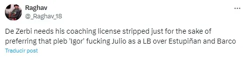 Un seguidor inglés disparó: “De Zerbi necesita que le quiten la licencia de entrenador sólo por preferir a Igor Julio como lateral izquierdo antes que a Estupiñán y Barco“.
