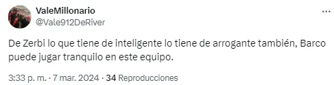El DT fue el blanco principal de las críticas y muchas de ellas se refirieron a la baja del ex Boca. “De Zerbi lo que tiene de inteligente lo tiene de arrogante también, Barco puede jugar tranquilo en este equipo“, resaltó uno de ellos.
