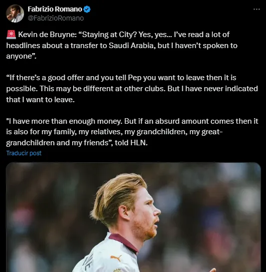 Respecto a los millones que puedan tentarlo desde Arabia para marcharse del vigente campeón de la Premier League, KDB dio una categórica respuesta: “Tengo dinero más que suficiente. Pero si llega una cantidad absurda que sea también para mi familia, mis parientes, mis nietos, mis bisnietos y mis amigos…“. Así, De Bruyne lo dejó claro: no se irá del Manchester City, a menos que reciba una oferta récord desde el fútbol árabe.