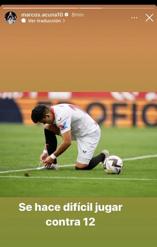 La storie en Instagram duró algunos minutos, ya que tiempo después la borró y volvió a compartir la misma imagen pero sin el texto. Claro, Acuña entendió que la publicación podría perjudicarlo de cara al futuro, ya que todavía no salió el informe del árbitro.