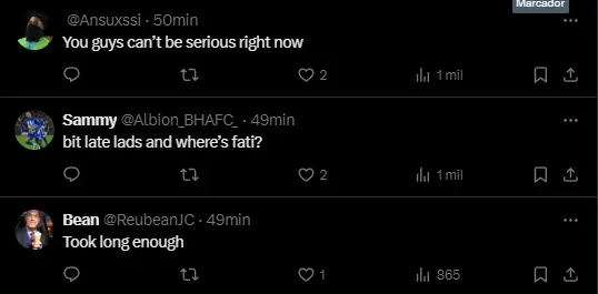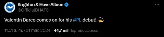 Tras haber debutado en la derrota contra los Reds, Brighton hizo un posteo para congratular al Colo por su estreno en Premier, pero los hinchas del conjunto del sur de Inglaterra cuestionaron los pocos minutos que tuvo. Con frases como “muy tarde“, “solo cinco minutos“, o incluso duras críticas como “sin sentido“, el público virtual de Brighton se mostró ofendido con Roberto De Zerbi por la decisión tomada con Barco.