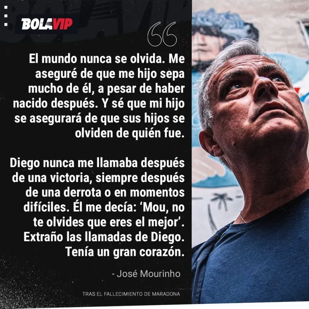 “Su fútbol lo podremos seguir viendo cada vez que queramos, siempre estará ahí, pero a Diego ya no. Era un buen amigo y tenía un gran, gran, gran corazón. Lo echaré de menos y echaré de menos sus llamadas. Siempre me llamaba después de las derrotas, nunca después de las victorias, porque en los momentos difíciles siempre estuvo ahí. Siempre me decía cuando perdía: ‘Mou, no te olvides que eres el mejor”, cerraba Mourinho en aquel entonces para hablar de su relación con Maradona“. Simplemente, conmovedor. No quedan dudas que lo sentimental puede influir en la decisión del portugués para hacerse cargo -o no- del Napoli.