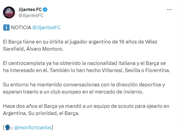 Además, Monfort agrega que el entorno del juvenil está en contactos con el club catalán, que ya mandó a un equipo de scouts para ojearlo en Argentina, y ahora espera poder ficharlo en el mercado de pases de invierno europeo, que abre en enero.