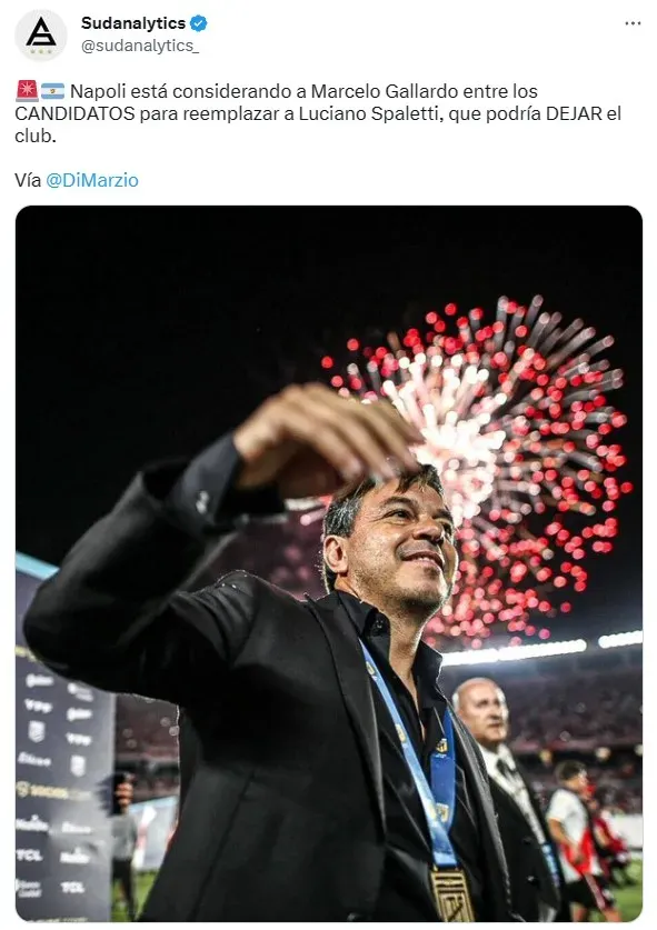 Según Di Marzio, Marcelo Gallardo está entre los principales candidatos a dirigir el Napoli mientras se rumorea -cada vez más fuerte- que Luciano Spaletti, el entrenador que llevó a los del Sur a un nuevo Scudetto, podría dejar la institución tras una temporada memorable.