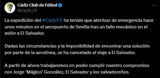 Mediante la cuenta oficial de Cádiz revelaron que tuvieron que regresar a tierra de emergencia y anunciaron la cancelación de la excursión rumbo a Centroamérica. “La expedición del Cádiz CF ha tenido que aterrizar de emergencia hace unos minutos en el aeropuerto de Sevilla tras un fallo mecánico en el avión a El Salvador. Dadas las circunstancias y la imposibilidad de encontrar una solución por parte de la aerolínea, se ha cancelado el viaje“, expresaron desde el Twitter oficial del club, revelando la compleja situación que vivieron, pero que en paralelo se encontraban todos a salvo.