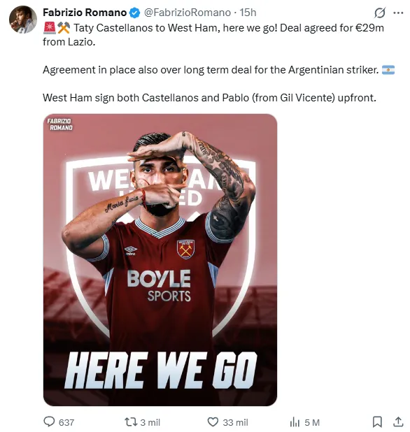 - West Ham ficha a Valentín Castellanos tras acordar un pago de 29 millones de euros.