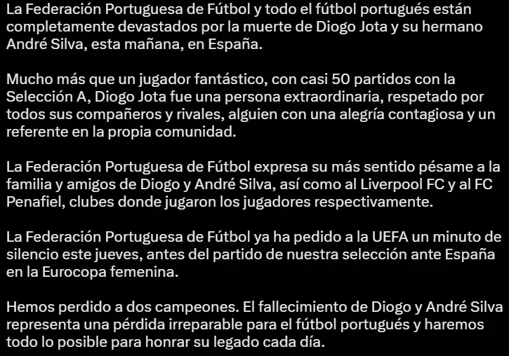 Cristiano Ronaldo fue compañero de Diogo Jota en la Selección de Portugal durante años. El máximo exponente del fútbol portugués escribió en sus redes sociales: “No tiene sentido. Justo ahora estábamos juntos en la selección, y ahora te casaste. A tu familia, a tu esposa y a tus hijos, les envío mis condolencias y les deseo toda la fuerza del mundo. Sé que siempre estarán con ellos. Descansen en paz, Diogo y André. Todos los extrañaremos”.