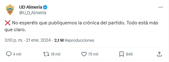 Tras finalizar el cotejo en el Estadio Santiago Bernabéu, en el cual sufrieron una controversial derrota ante Real Madrid, el Almería emitió una publicación a través de su cuenta oficial de X que no hizo más que avivar la polémica.