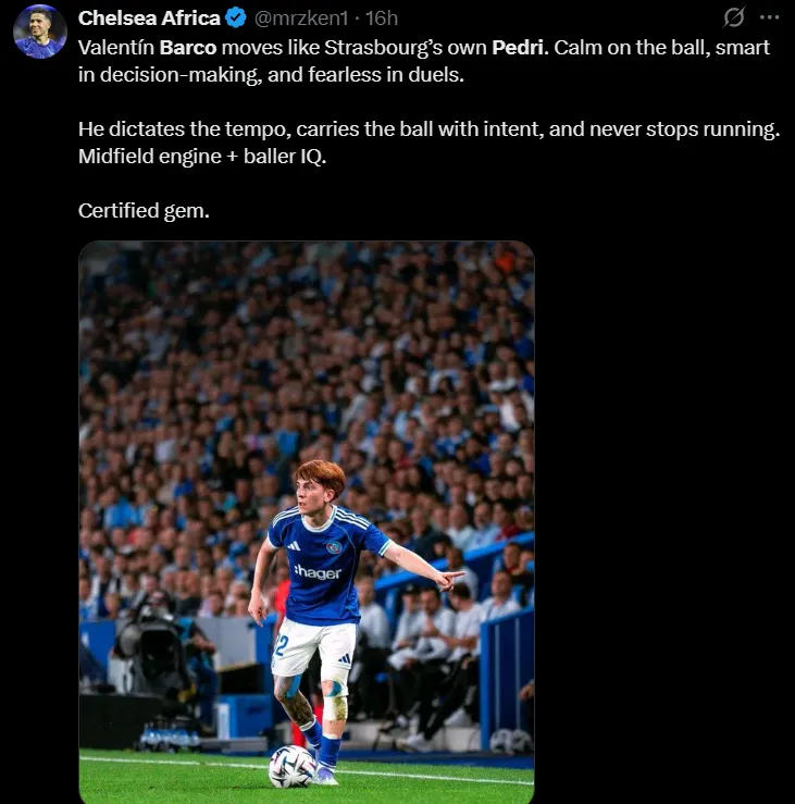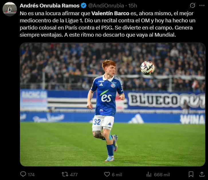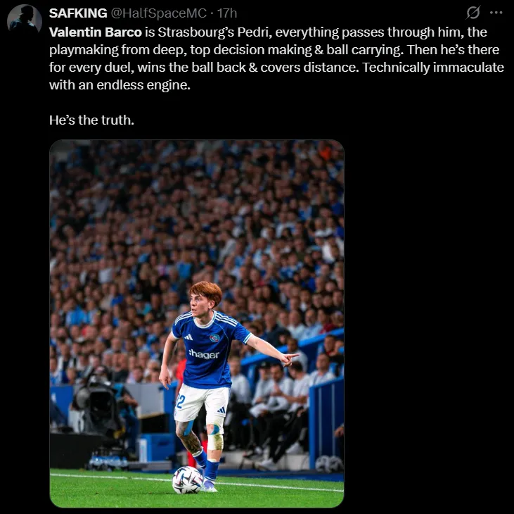 “Valentín Barco se mueve como el mismísimo Pedri del Estrasburgo. Tranquilo con el balón, inteligente en la toma de decisiones e intrépido en los duelos. Marca el ritmo, lleva el balón con determinación y nunca deja de correr. Motor de centro del campo más inteligencia de balón. Una gema certificada”, escribió un fanático en X.