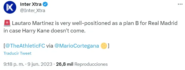 Según informó Mario Cortegana, cronista del Real Madrid en The Athletic, el surgido en Racing “está muy bien posicionado como plan B si no llega a concretarse la llegada de Harry Kane”. El gigante español busca al sucesor de Benzema y ahí está Lautaro, pase lo que pase en Estambul.