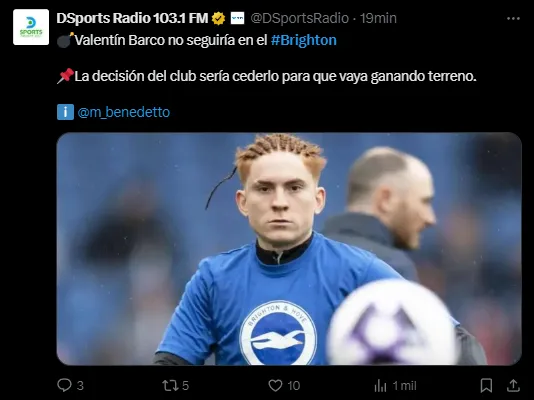 Según informó el periodista Marcelo Benedetto en D-Sports, Valentín Barco saldría de Brighton en el próximo mercado de pases a préstamo para que el Colo pueda adquirir la experiencia suficiente en otro club y que regrese al equipo blanquiazul con mayor rodaje en el viejo continente.