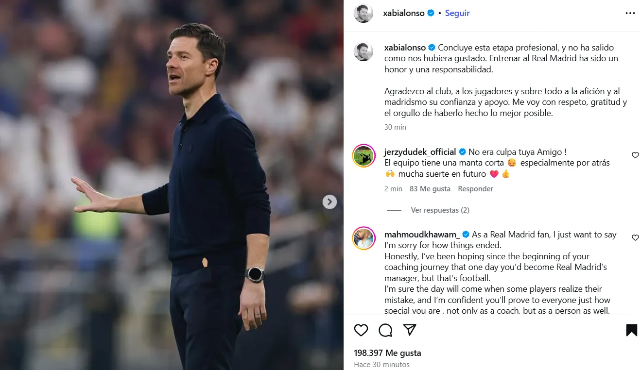 “Concluye esta etapa profesional, y no ha salido como nos hubiera gustado. Entrenar al Real Madrid ha sido un honor y una responsabilidad. Agradezco al club, a los jugadores y sobre todo a la afición y al madridismo su confianza y apoyo. Me voy con respeto, gratitud y el orgullo de haberlo hecho lo mejor posible”, expresó Xabi Alonso en sus redes sociales.