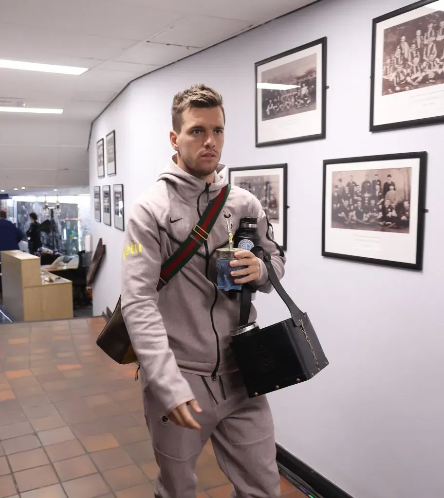 Minutos previos a que se de el inicio del partido, como suele hacerlo en la previa de cada partido, la cuenta oficial del Tottenham sube fotos de la llegada del plantel en sus redes sociales, y allí publicó una de Lo Celso, en la que tiene un termo con un escudo inusual.