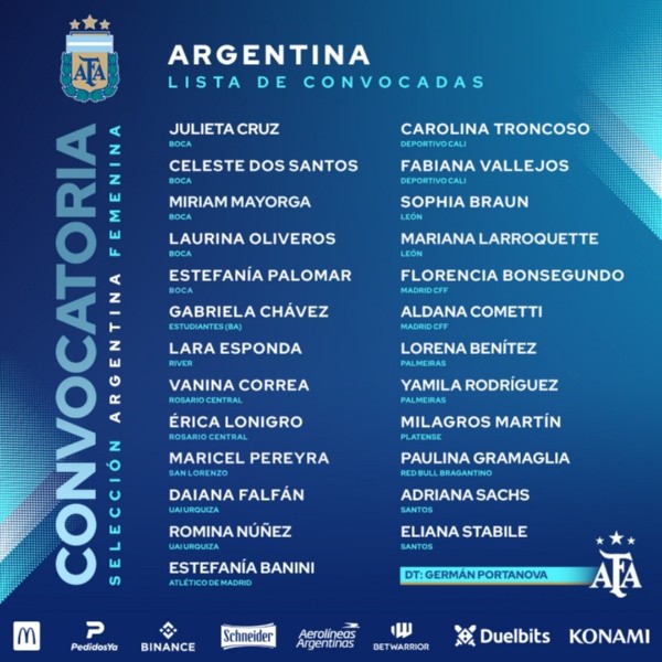 Para estos dos amistosos, el seleccionador convocó a un total de 25 jugadoras, nuevamente mechando entre jugadoras del exterior, del fútbol local, algunas debutantes y varias jugadoras jóvenes que comienzan a dar sus primeros pasos con la celeste y blanca. Los nuevos nombres son la enganche de Platense de apenas 15 años Milagros Martín y las dos GladiadorasCeleste Dos Santos y Estefanía Palomar (convirtió el gol de Boca en la victoria ante Belgrano por la cuarta fecha).