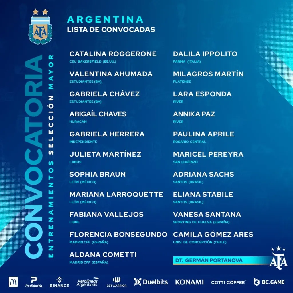 ¿Quiénes son? De aquellas que son habitués de las concentraciones argentinas, quienes deberían ser citadas son Laurina Oliveros, Julieta Cruz y Myriam Mayorga (Boca), Romina Núñez y Daiana Falfán, de UAI Urquiza, y Vanina Correa y Erica Lonigro de Rosario Central. Son siete jugadoras que forman parte de la columna vertebral que menciona siempre el DT y por las que espera muy atento.