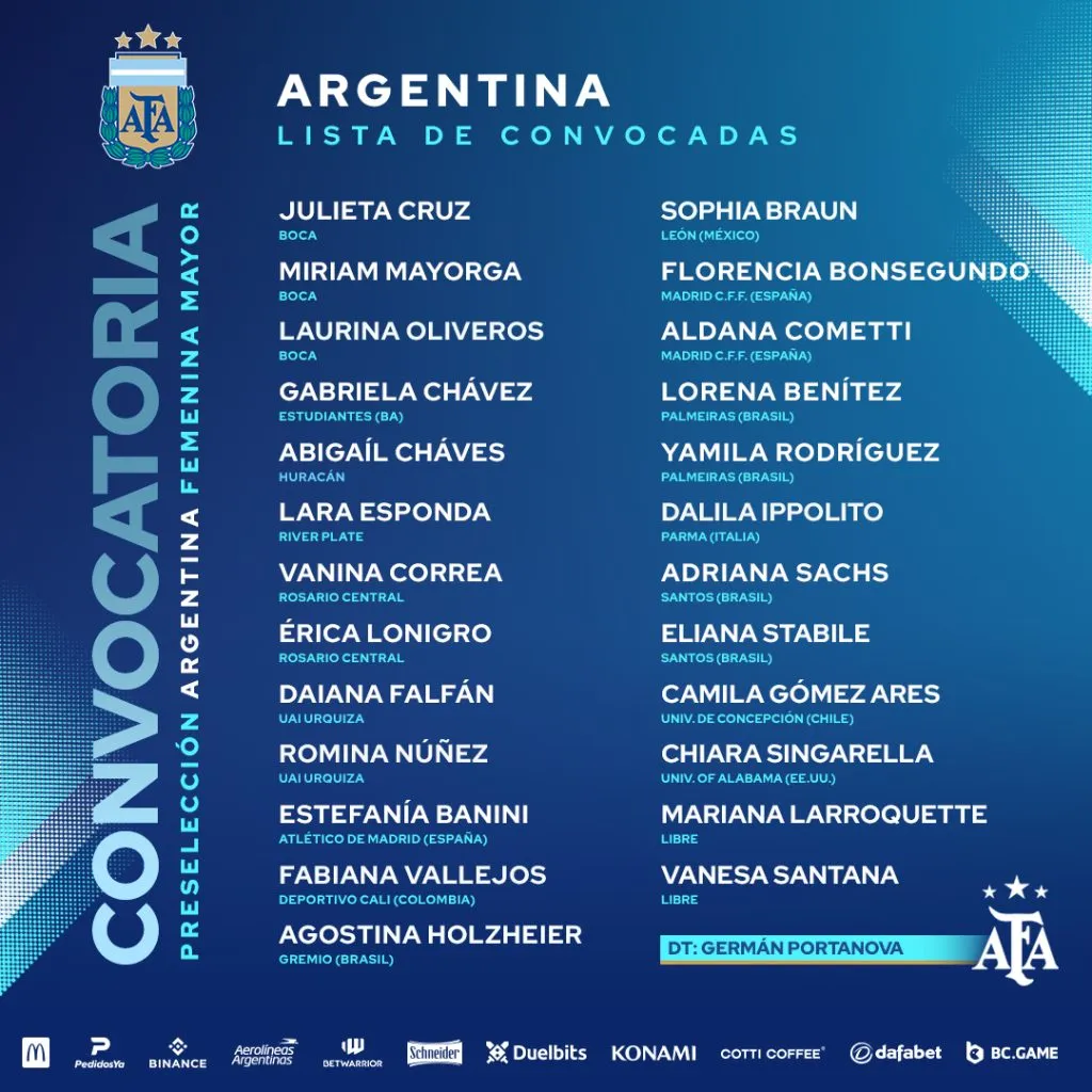 Si bien resta que el DT anuncie las 23 finales, hay algunos nombres que se sumaron a este último proceso y que podrían ser parte de la lista definitiva: la ex Boca Fabiana Vallejos, hoy en Deportivo Cali de Colombia; la exRiver Agostina Holzheier, jugadora del último Sub 20; Adriana Sachs, de gran recorrido en la Selección; Camila Gómez Ares, hoy en Chile; Chiara Singarella, que no jugó la Copa América pero es una habitual citada; y Lorena Benítez quien se recuperó de su lesión y desde ese momento es fija en el equipo.