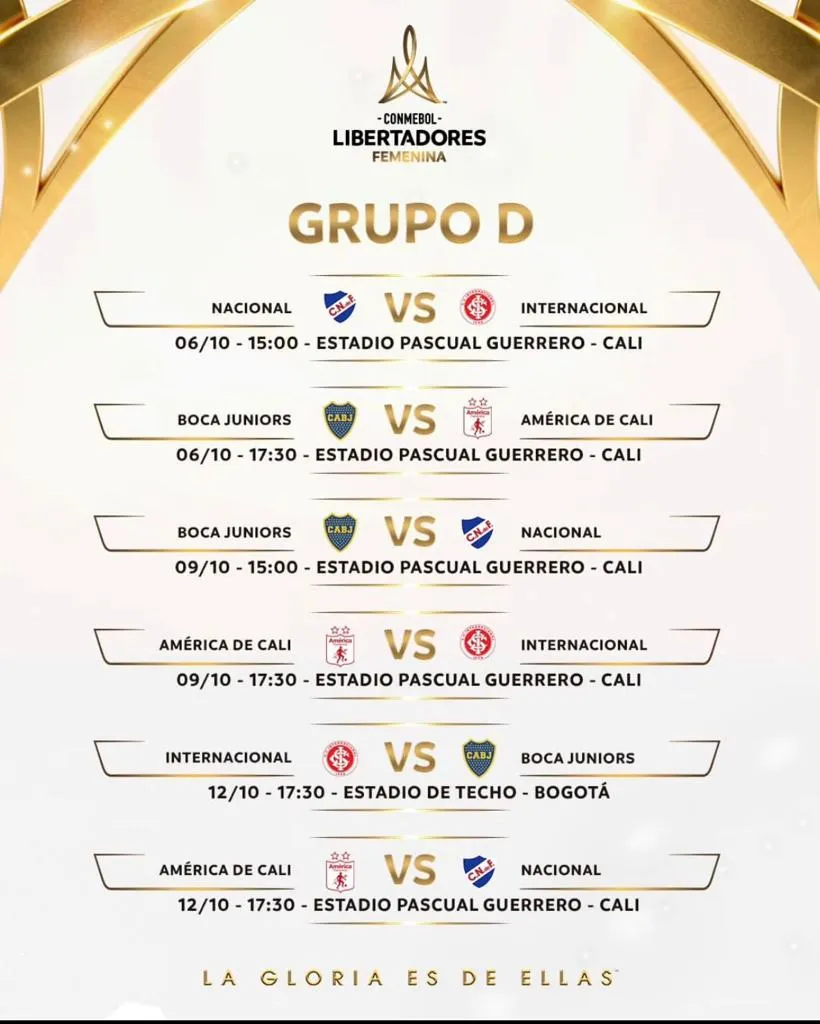 El segundo encuentro será el lunes 9, a las 15 y ante Nacional de Uruguay. El cierre de la fase de grupos será en el Estadio de Techo, en Bogotá, y ante las brasileñas del Internacional, el jueves 12 de octubre a las 17.30.
