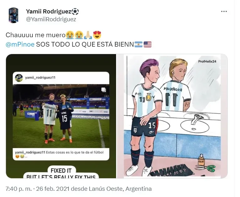 “La pude conocer a una de mis ídolas en el fútbol y pude quedarme con la camiseta de ella, fue lo más lindo que me pasó“, escribió la misionera, sosteniendo la casaca de Rapinoe al tiempo que la delantera estadounidense se llevó la suya con la 11. La foto, sin embargo, fue replicada por Rapinoe: “Lo arreglé pero realmente arreglemos esto @afaseleccion”, escribió.