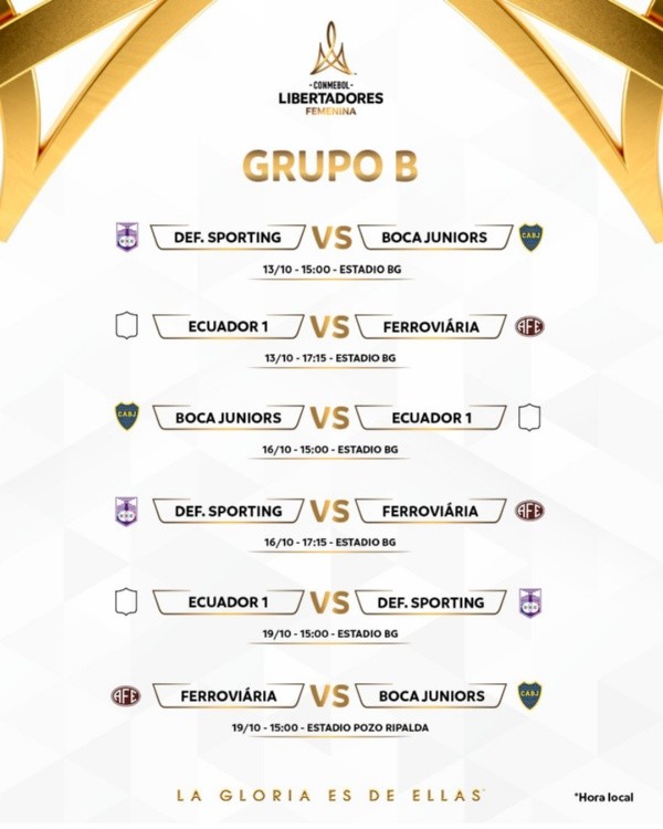 Boca formará parte del Grupo B, compuesto por Defensor Sporting de Uruguay, Ferroviaria de Brasil (fue tercero en la última Libertadores) y un equipo más de Ecuador, que se definirá entreLas Dragonas de IDV y el Club Ñañas, que deberán enfrentarse en la final de la Superliga Femenina (el domingo 25). El ganador de ese partido irá a la zona de Boca.