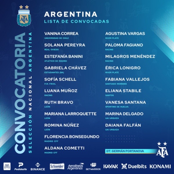De la citación inicial hubo dos cambios:se sumaron Agustina Vargas (River) y Milagros Menéndez (Racing) en lugar de Dalila Ippolito y Marianela Szymanowski, ambas bajas por lesión.
