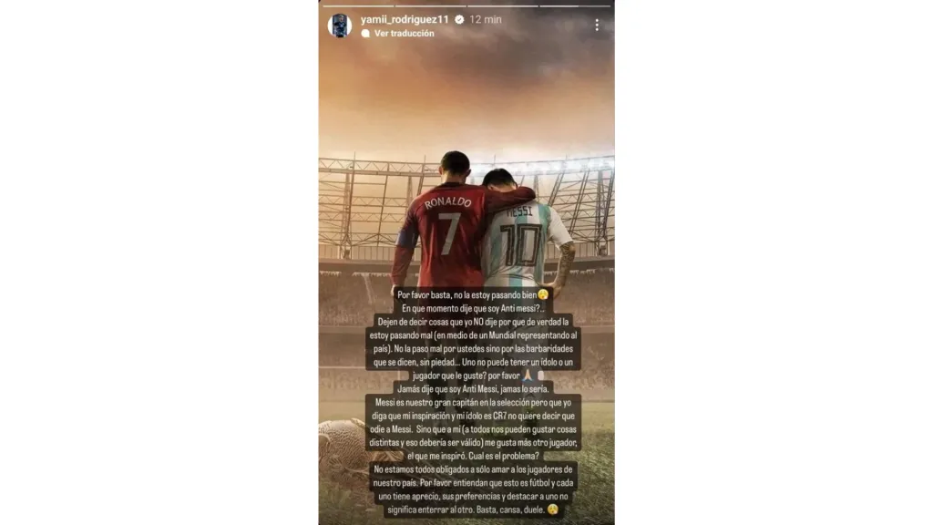 Junto a una imagen de Leo y Cristiano Ronaldo abrazados, Yamila se abrió en redes sociales: “Por favor basta. No la estoy pasando bien. ¿En qué momento dije que soy anti Messi? Dejen de decir cosas que yo no dije porque de verdad la estoy pasando mal (en medio de un Mundial representando al país). No la paso mal por ustedes sino por las barbaridades que dicen sin piedad. ¿Uno no puede tener un ídolo o un jugador que le guste? Por favor. Jamás dije que soy anti Messi y jamás lo sería. Messi es nuestro gran capitán en la Selección, pero que yo diga que mi inspiración y mi ídolo es CR7 no quiere decir que odie a Messi“.