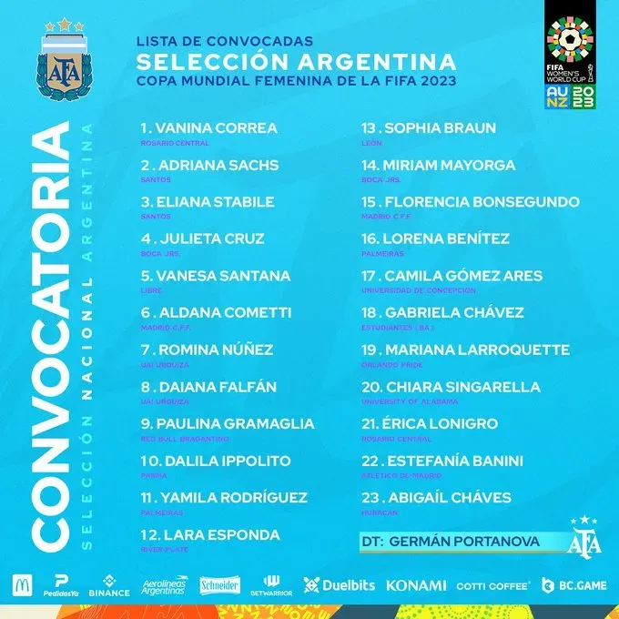 Germán Portanova ya definió la lista definitiva de 23 futbolistas que representarán a la Selección Argentina en el Mundial Femenino 2023 que se realizará con sede compartida entre Australia y Nueva Zelanda, del jueves 20 de julio al domingo 20 de agosto.